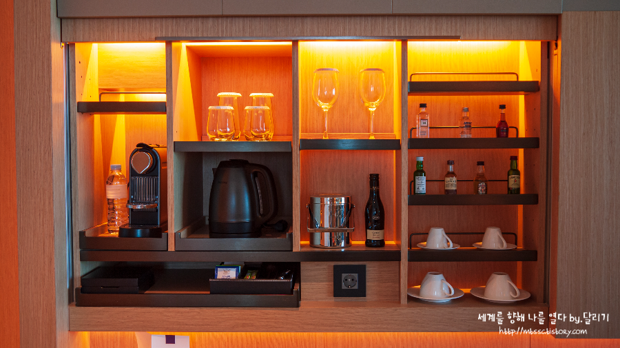 벽면에 미니바가 있는 것은 일반 룸과 동일합니다. (일반 객실인 프리미엄 리버뷰 스테이 후기는 아래의 링크를 참고)