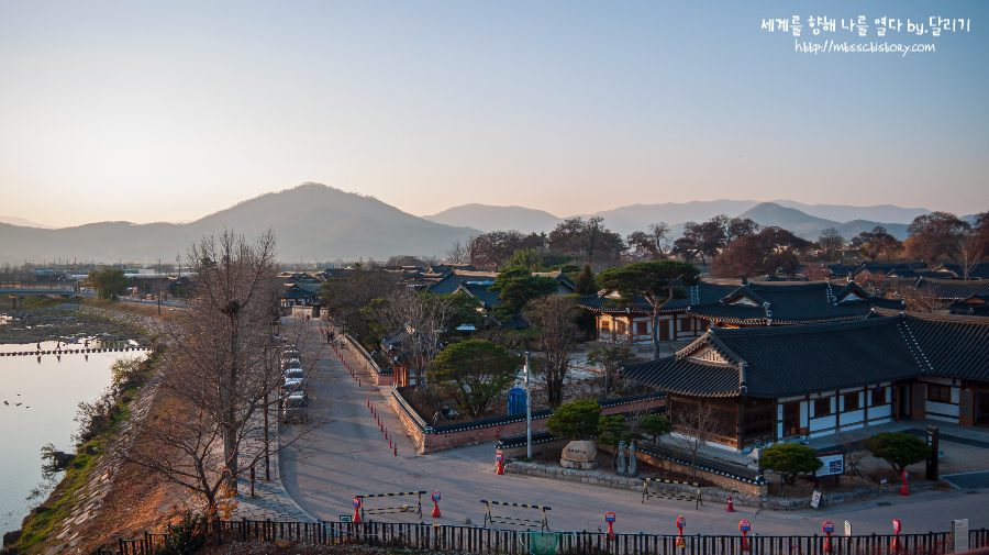 월정교 난간 너머로는 유유히 흐르는 남천과 예쁜 한옥들이 모여있는 교촌마을, 그리고 그 뒤로 경주시를 감싸고 있는 크고 작은 산들이 아름답게 펼쳐져 있습니다.