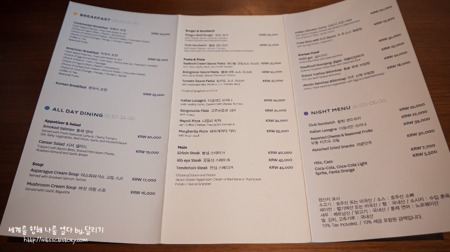 룸서비스는 24시간 운영 중이었는데요. 가격이 호텔 치고는 크게 비싸지 않은 편이었어요. 메뉴당 2~4만원 정도? (위의 메뉴판은 2020년 11월에 찍은 것이라 현재는 메뉴나 가격이 다를 수 있습니다.)