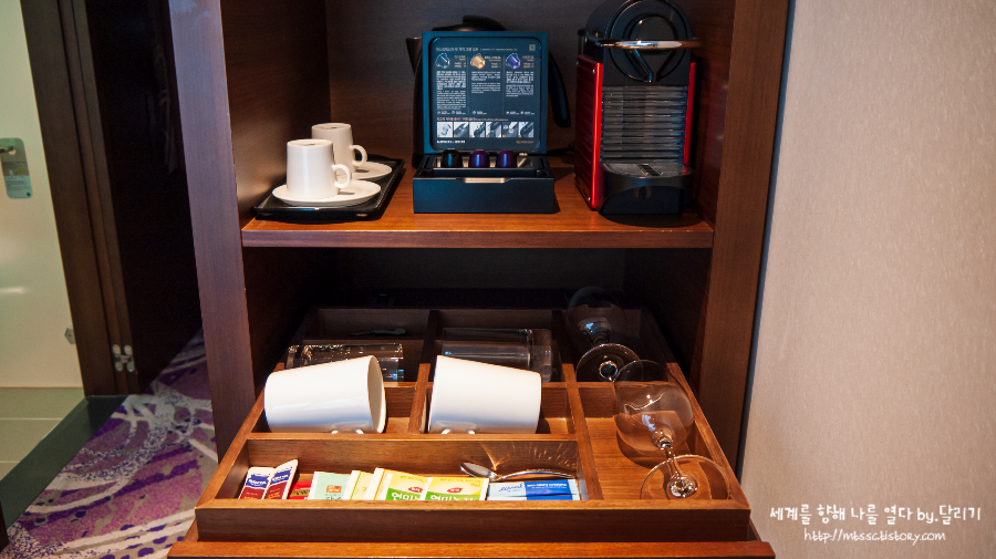 그런데 디럭스 룸은 이전에 이용했던 슈페리어 룸과 큰 차이가 없어 보였는데요. 객실 크기도 동일하고, 욕실도 같은 구조였습니다. 디럭스 룸이 슈페리어 룸과 달랐던 것은 미니바에 무료 이용이 가능한 캡슐 커피 머신이 있었다는 정도...?