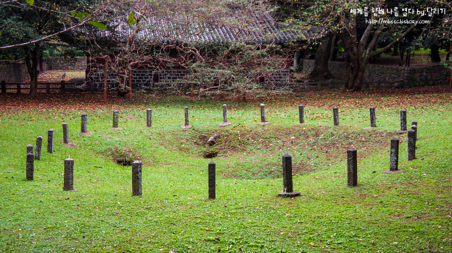 삼성전 옆으로 돌아가니 드디어(!) 삼성혈을 볼 수 있었습니다. 생각보다 꽤 크게 푹 꺼진 땅에 세 개의 구멍이 보였어요 ㅎㅎ