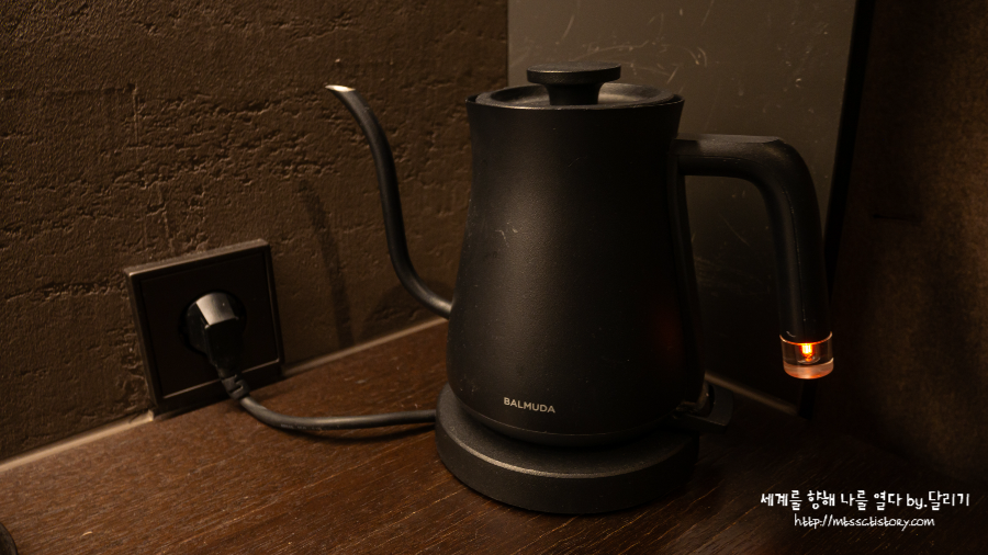 찻잎과 정수기도 있었어요. 이 아래쪽에 미니 냉장고도 하나 있어서 조식 키트는 냉장고에 넣어두었습니다 ㅎㅎ