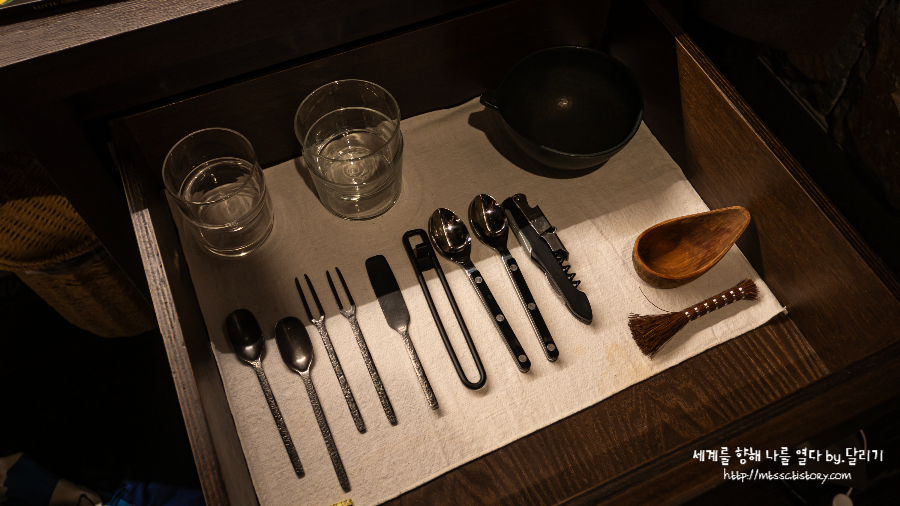컵과 숟가랑 등 간단한 식기도구는 침대 옆 테이블 선반 속에 가지런히 놓여있었습니다 :D
