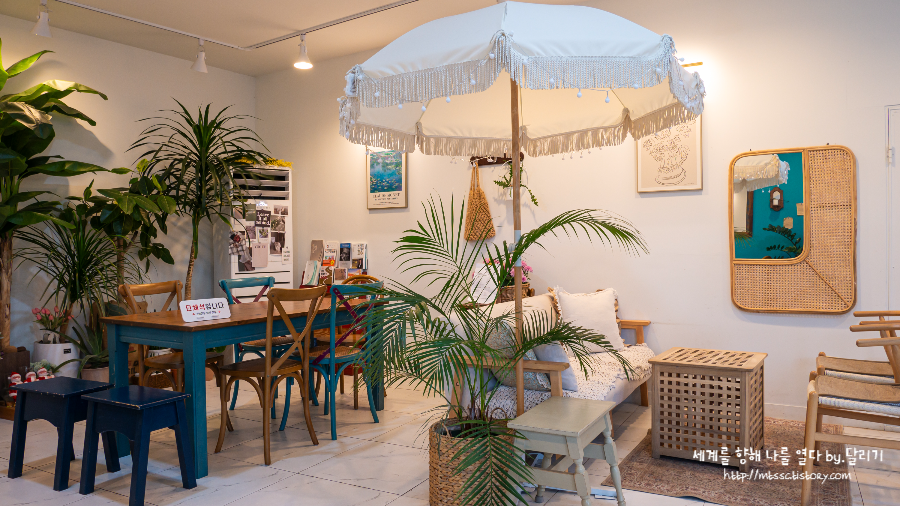 적당한 규모의 카페였고 제가 방문했을 땐 한산했는데요. 일단 분위기가 마음에 들었습니다. 카페 밖은 꽤 쌀쌀했는데 안으로 들어오니 따뜻한 남국의 분위기로 확 바뀌었거든요 ㅎㅎ