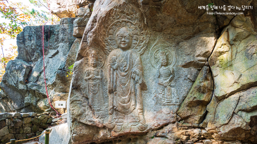 서산 용현리 마애여래삼존상 계단을 쭉 따라 올라와 시선을 좌측으로 돌리면 드디어 화강암 절벽 한쪽 면에 새겨진 삼존불상이 모습을 드러냅니다. 아래에서는 마애불의 모습이 잘 보이지 않고 절벽 아래에 다다라서야 그 모습을 드러내는데요. 그래서인지 뭔가 더 드라마틱하게 짠! 하고 등장하는 느낌이에요.