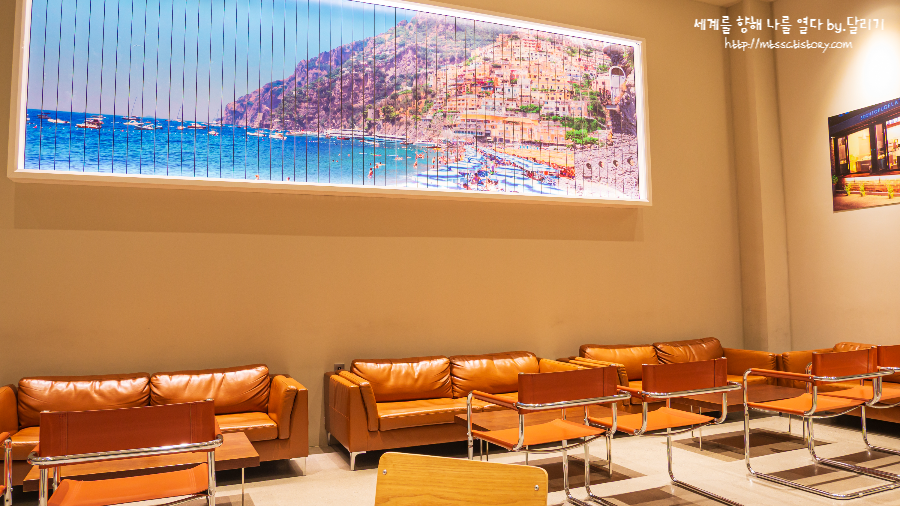젤라또를 받아서 3층으로 올라왔더니 이 넓은 공간에 손님이 아무도 없었습니다. 통창 너머로는 바다가 있는데 저는 늦은 저녁 시간에 방문해서 아무것도 보이지 않았습니다. 낮에 방문하신 다른 분들의 후기를 찾아보니 뷰가 정말 예뻐요!