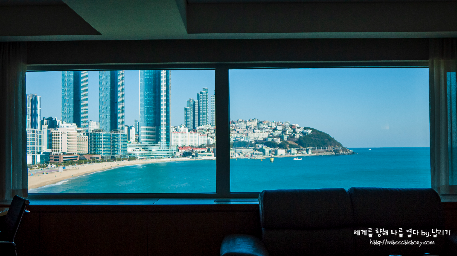 소파 뒤로는 웨스틴 조선 부산 호텔의 자랑이라 할 수 있는 해운대 뷰가 펼쳐져 있었습니다.