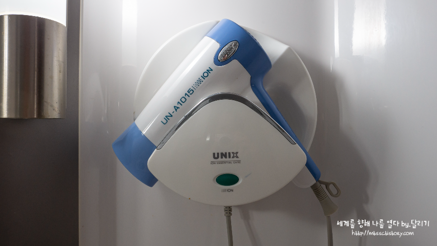 드라이기는 벽에 부착되어 있는데요. 이게 정말 불편합니다. 버튼을 누르고 있어야만 바람이 나와요(...). 머리 짧은 사람들은 그래도 금방 말릴 수 있어서 다행인데, 머리 긴 분들은 엄청 불편할 거라고 생각합니다.