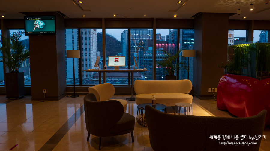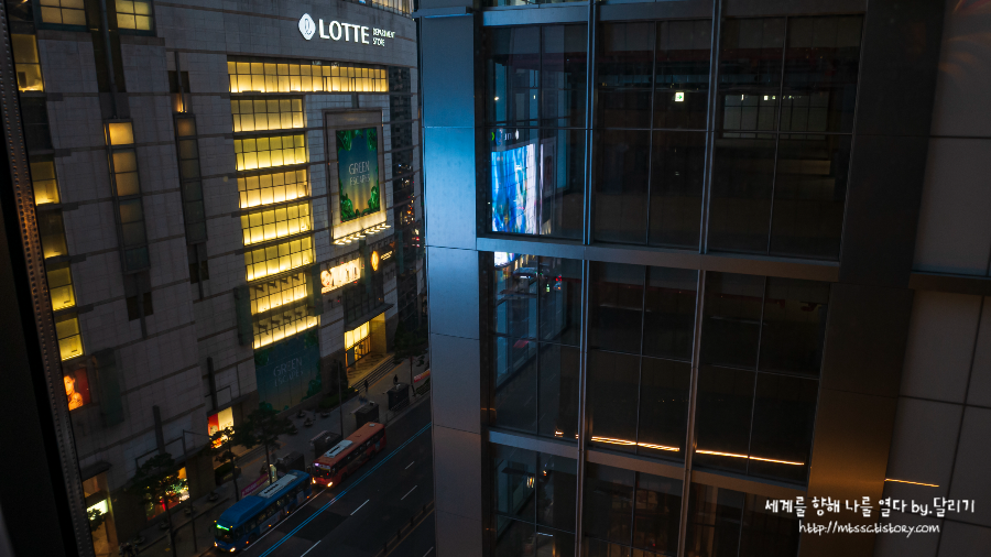 창 밖 뷰는 맞은편 (애플스토어 있는) 건물 뷰였습니다(...). 대각선으로 고개를 돌리면 롯데백화점 본점과 대로가 살짝 보였습니다.