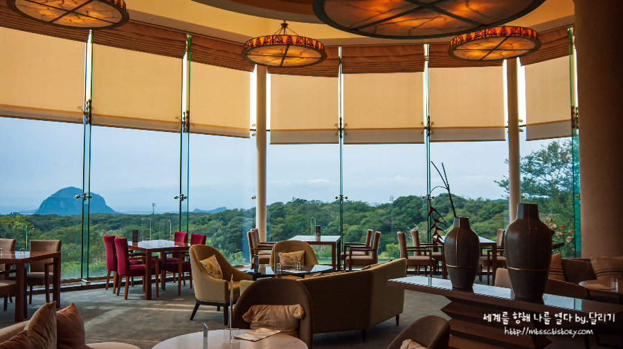 산방산이 배경으로 보이는 라운지에 왔습니다. 다들 멀리 관광 가시거나 골프 치러 나가셨는지 수영장도, 라운지도 한산했습니다 ㅎㅎ