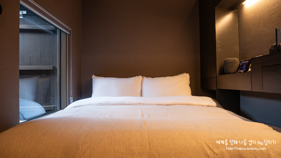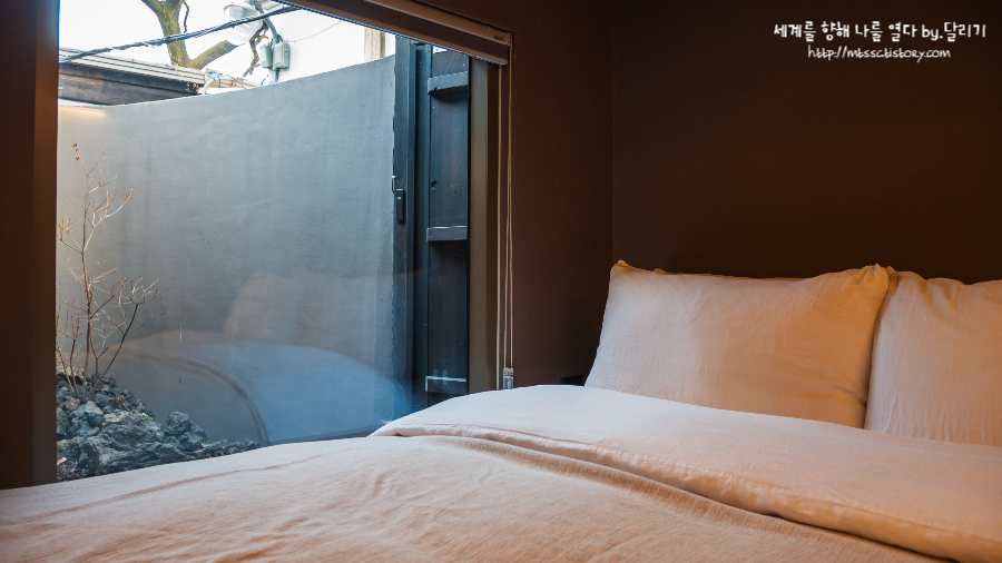 침대 옆으로는 통창이 하나 있는데, 창 너머로 앞에서 보여드렸던 바위 정원이 보여요. 침대에서 멍하니 정원을 감상하는 게 참 좋았어요. 혼자서 힐링하기에 정말 좋은 공간이었습니다.