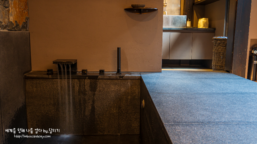 입구 맞은 편에는 거친 돌벽이 커다랗게 서 있고, 그 아래에 커다란 욕조가 있었어요. (물은 제가 틀어봤어요 ㅎㅎㅎ)